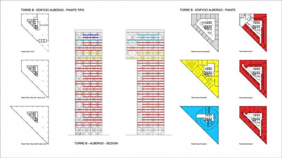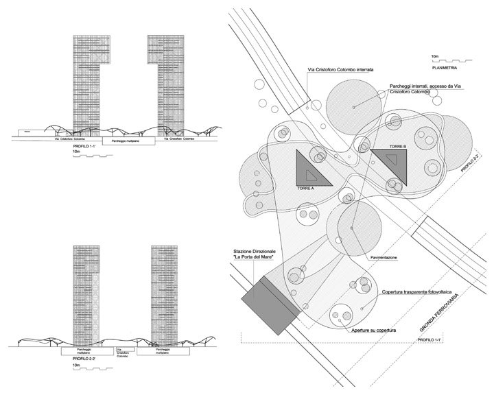 Visibili da grande distanza, le due torri formano un gigantesco portale socchiuso. I due monoliti caratterizzano il nodo di scambio della mobilità su ferro e su strada per e dal litorale di Ostia e la zona Pontina. La loro altezza e forma sono un omaggio alla città di Roma che richiama l’arco di alluminio di Adalberto Libera mai realizzato, come simbolico segno di apertura della città eterna che si trasforma in un moderno luogo di funzioni . In cima a sbalzo il “museo del territorio”, e dall’altra parte una grande serra trasparente aperta al pubblico, e poi ristoranti, un albergo, un centro civico, una sala congressi una biblioteca, uffici, un asilo nido e una scuola materna al piano terra e altre funzioni terziarie e commerciali nei piani intermedi frammisti ad aree verdi pensili. Inoltre sono previsti grandi parcheggi sotterranei, il parco territoriale e la linea in sede protetta per l’Eur che formerà un vero e proprio centro di attrazione per i cittadini e i lavoratori che vi transiteranno. Nel nodo di scambio avrà sede la principale stazione del sistema di trasporto in sede protetta su binari (sopraelevato con altezze variabili per garantire il minor impatto ambientale possibile) che dall’Eur servirà tutti i sedimi urbani lungo la Colombo fino all’Infernetto e Casal Palocco per poi dirigersi alla direzionalità della Fiera di Roma, assorbendo il traffico pendolare dalla zona Pontina, o dal litorale nord di Roma e di Ostia e zone satelliti.